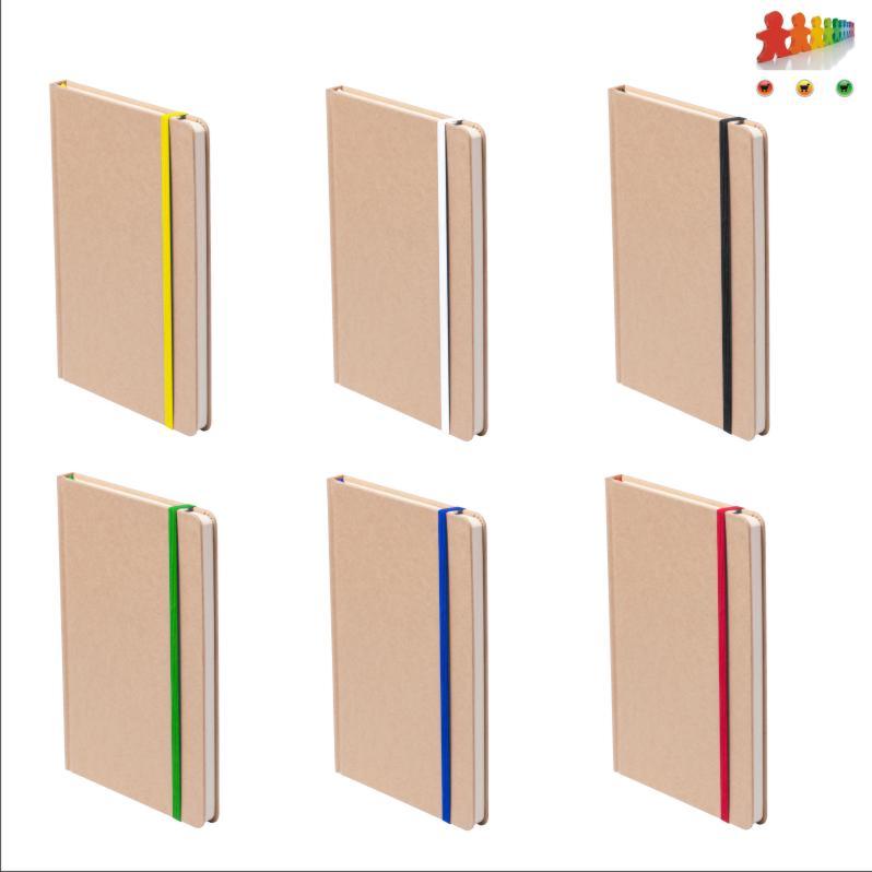 Blocco note con rivestimento in cartone con 100 fogli, segnalibro colorato e cinturino in gomma.