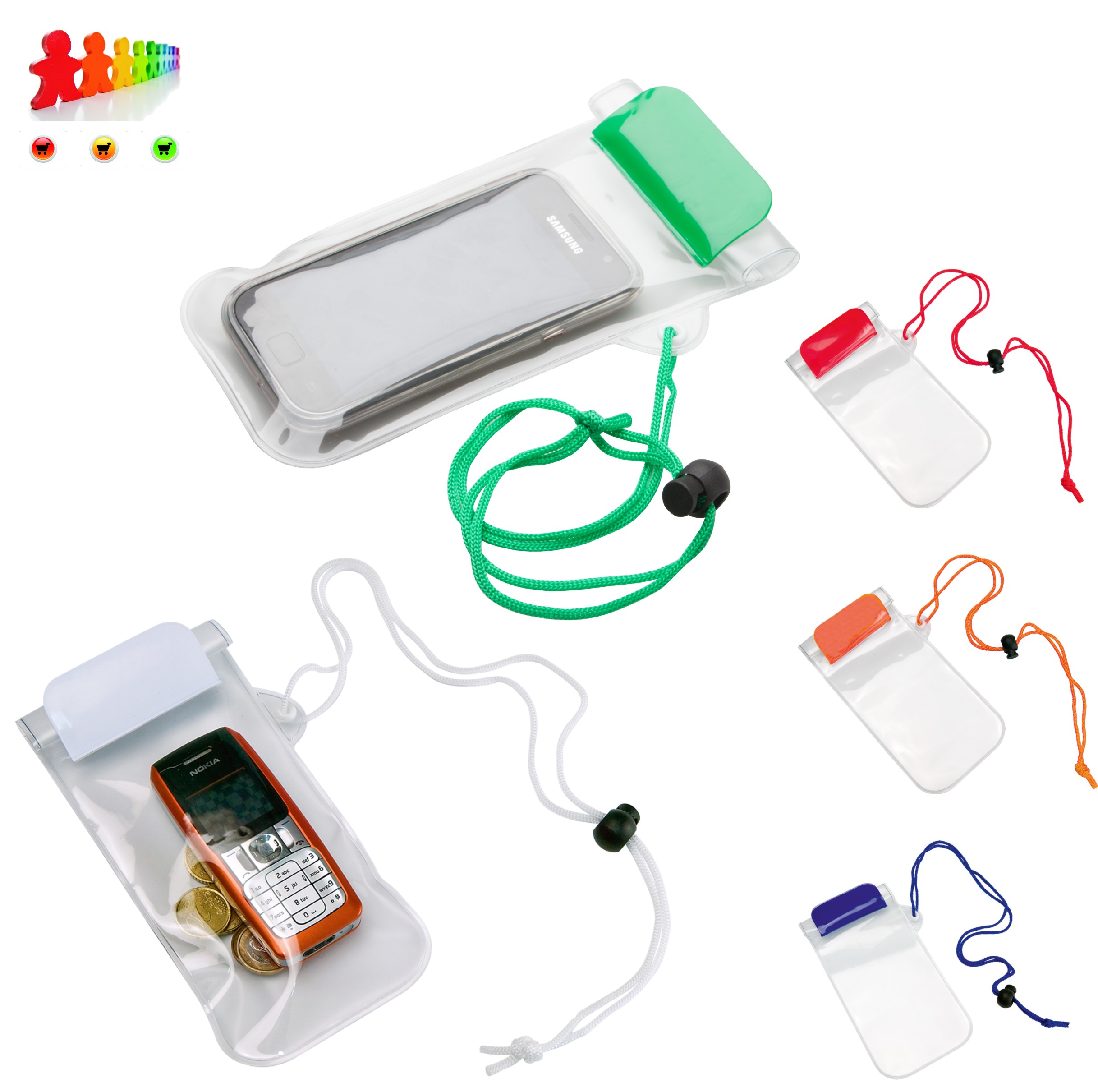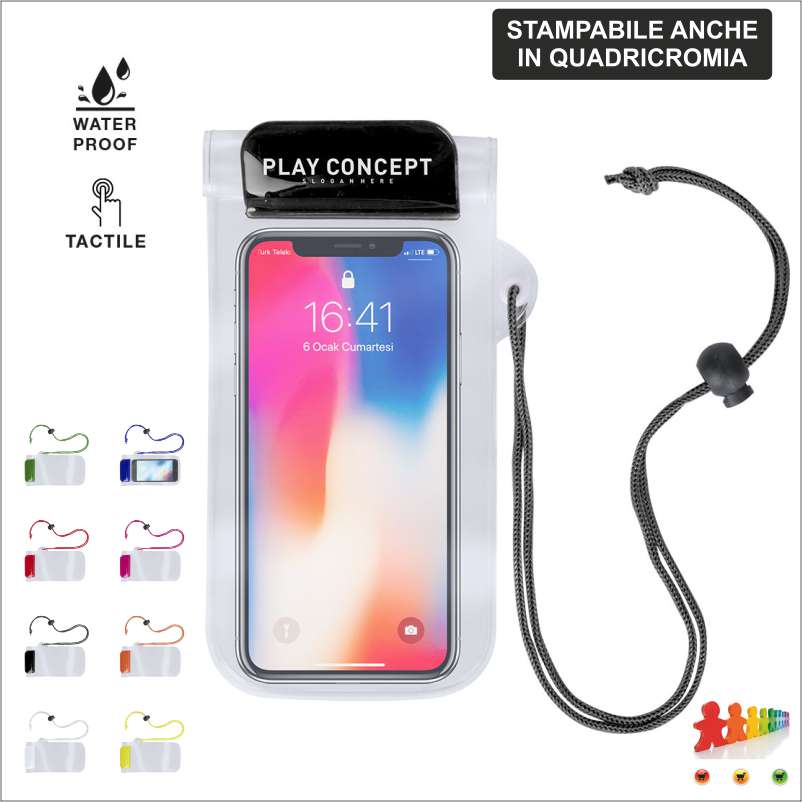 Descrizione custodia impermeabile per cellulare in plastica con laccetto da collo.