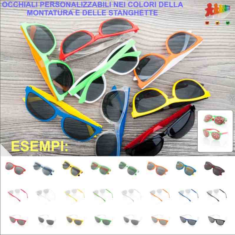 Occhiali da sole in plastica con protezione UV400. Il prodotto viene assemblato nella richiesta combinazione di colore telaio – lenti. Quantità minima: 50 pezzi.