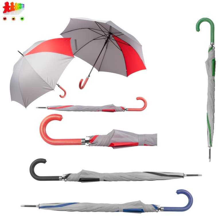 Product description:tab Ombrello automatico antivento con 8 pannelli, un pannello colorato, maniglia in finta pelle, asta in metallo e stecche in metallo/fibra di vetro . Materiale: pongee 190T.par