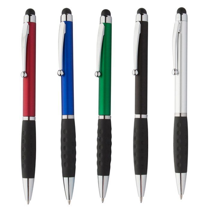 Penna a sfera in plastica con gommino capacitivo, impugnatura in gomma e refill blu. |