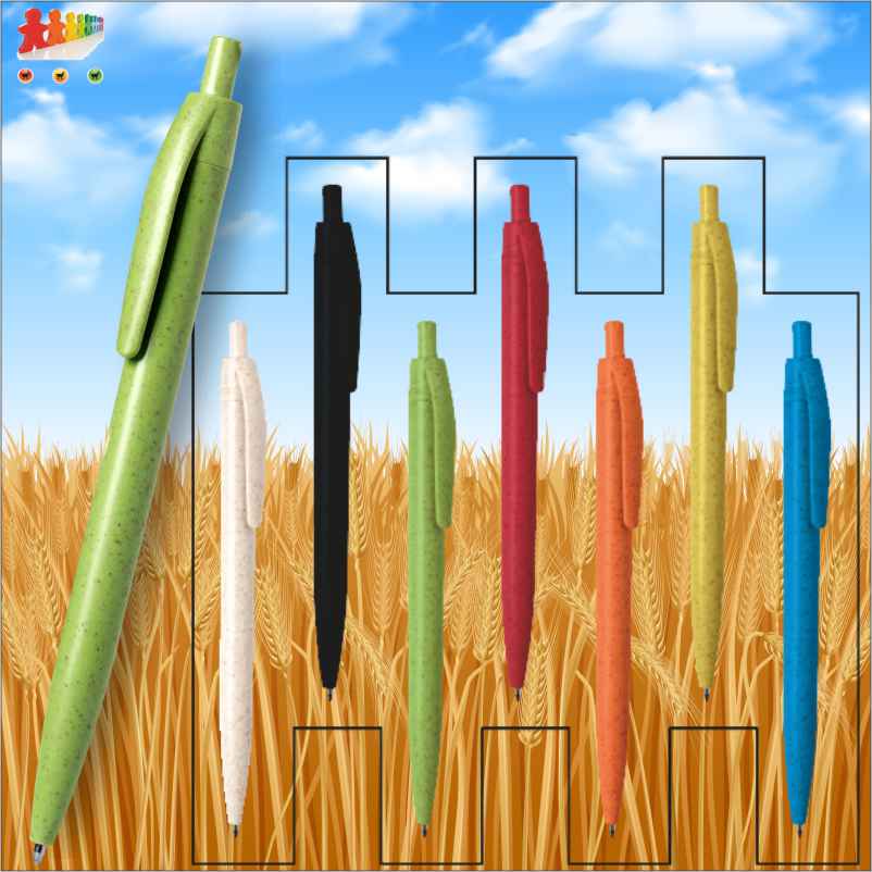 | Descrizione | Penna a sfera ecologica con corpo in plastica ricavata dalla paglia di grano e refill blu. |
