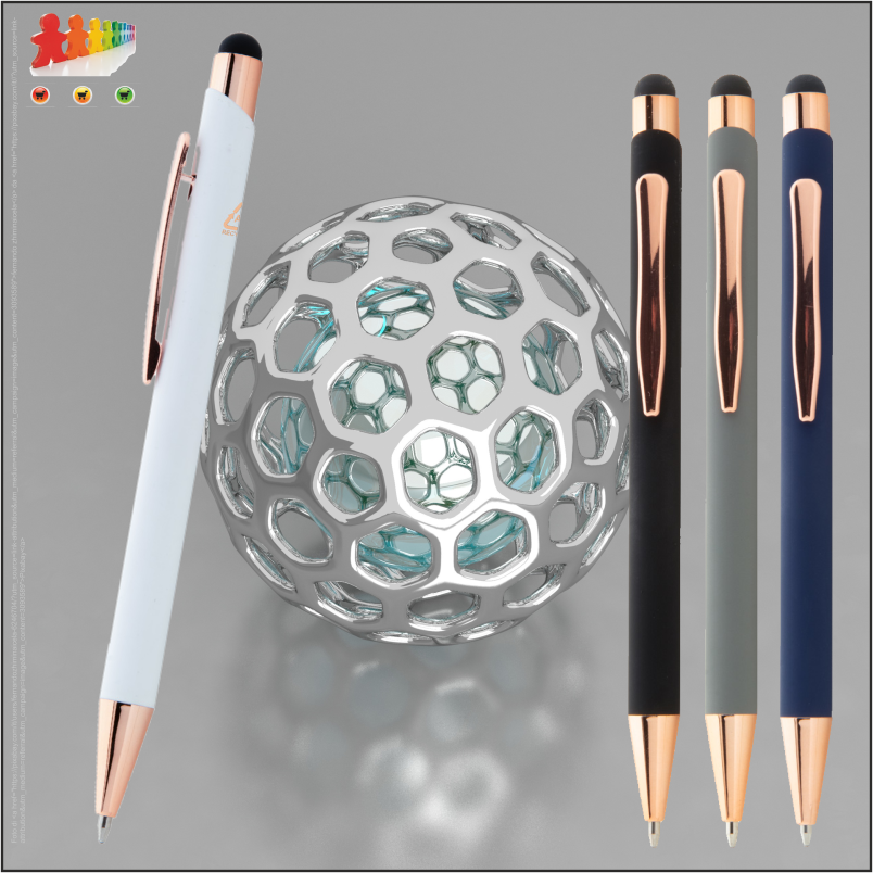 | Descrizione | Penna a sfera capacitiva in alluminio riciclato con finitura gommata, dettagli color oro rosa e refill blu. Rivestimento speciale per incisione laser a specchio in colore similare ai particolari oro rosa |
