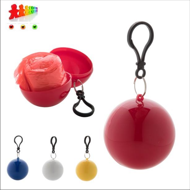 Portachiavi con moschettone e poncho per bambini ripiegato a forma di palla.