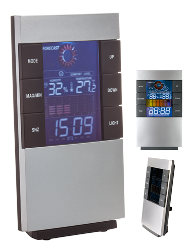 Product description:tab Orologio digitale e stazione meteo con display a colori Funzioni: Sveglia, termometro, igrometro e memoria di tendenza temperatura. Funziona con 2 batterie AAA, senza batterie.par