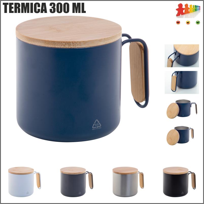 | Descrizione | Tazza termica da 300 ml. a doppia parete, in acciaio inox riciclato con coperchio e manico in bambù. |