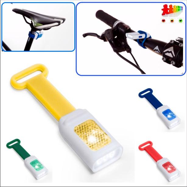 Torcia elettrica in plastica con cinghia in silicone, 3 LED e parte riflettente. Consegnato con batteria a bottone. La torcia può essere fissata anche sul manubrio di una bicicletta.