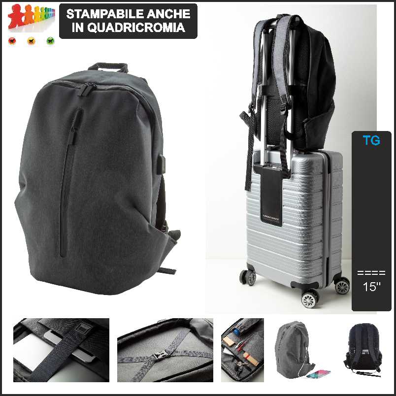 | Descrizione | Zaino con scomparti multipli e zip, scomparti imbottiti per laptop (15″) e tablet, tasche interne per organizer, schienale e spallacci ergonomici. Con cinghia per trolley e connessione USB integrata per power bank. |