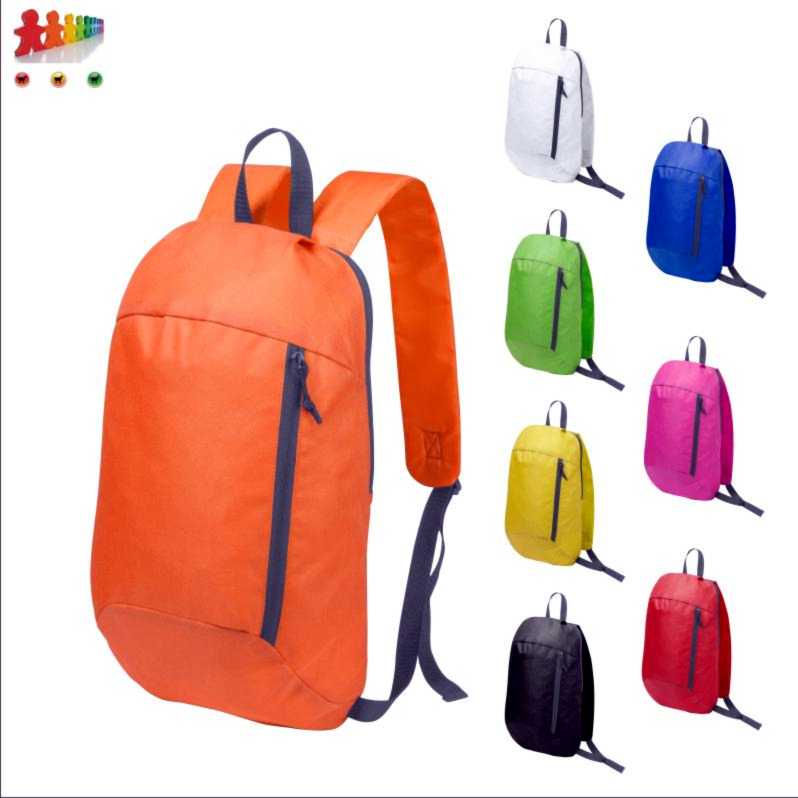 Zaino in poliestere 600D con schienale imbottito, tracolle regolabili e tasca frontale con zip.