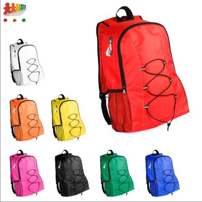 Zaino con tracolla regolabile, presa per cuffie. Tasche di rete laterali e scomparto principale con zip. In poliestere 600D.